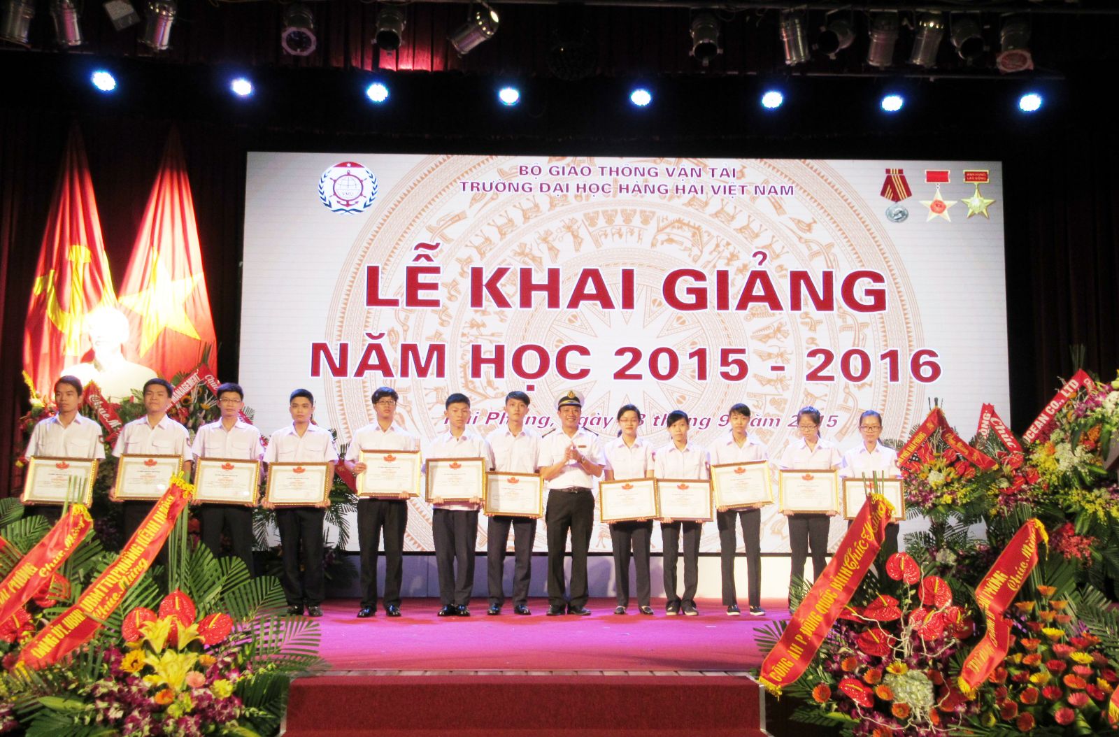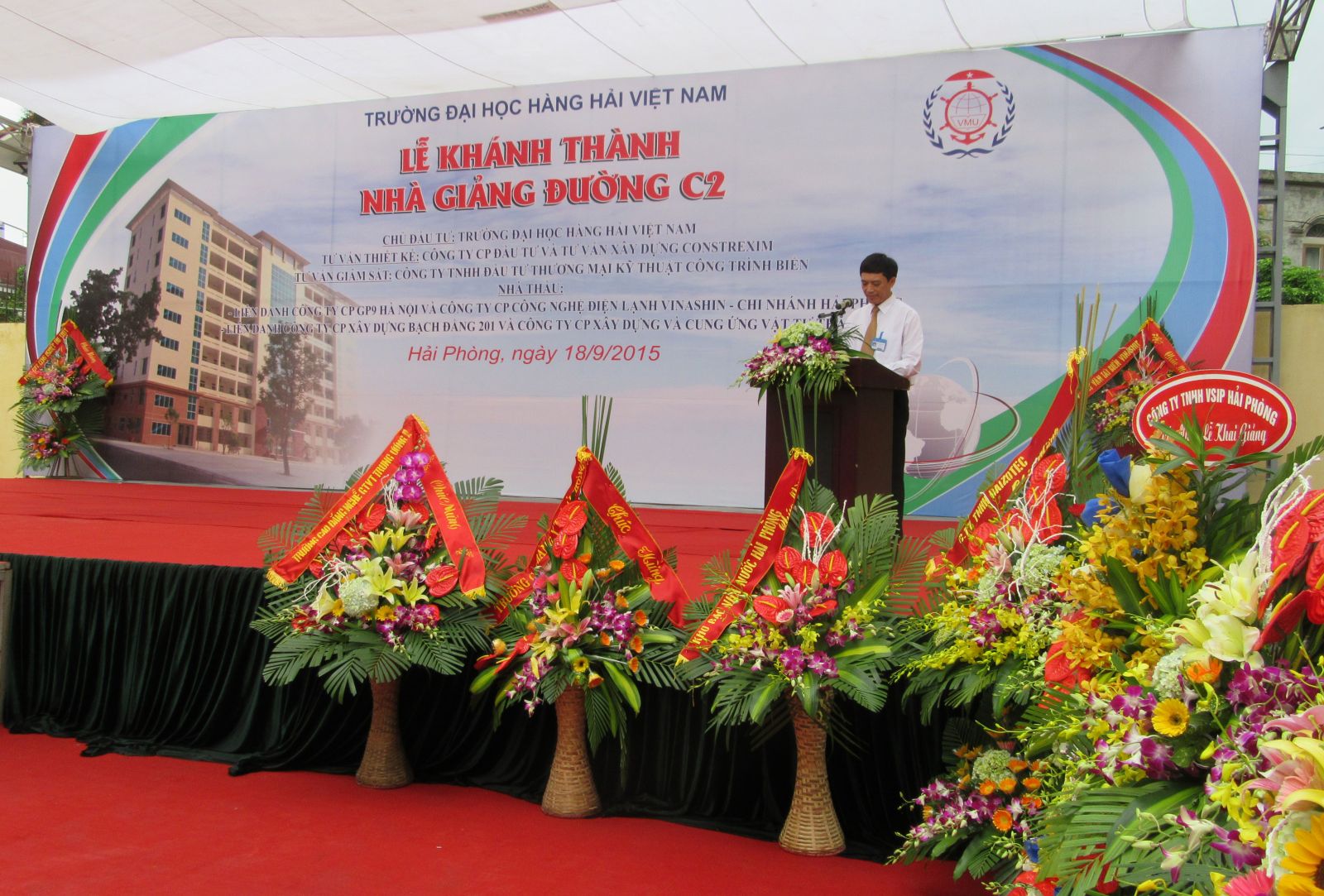 Hòa chung trong không khí tưng bừng phấn khởi của đất nước ta, dân tộc ta với những phút giây hào hùng của mùa thu lịch sử, kỉ niệm trọng thể những ngày lễ lớn: 70 năm ngày cách mạng tháng 8 thành công và quốc khánh 2/9, 70 năm ngày truyền thống ngành Giao thông vận tải, thực hiện sự chỉ đạo của Bộ Giao thông vận tải, được sự nhất trí của các cấp các ngành, 09h00 ngày 18/9/2015 tại hội trường A8, Trường Đại học Hàng hải Việt Nam đã long trọng tổ chức Lễ Khai giảng năm học 2015-2016, đồng thời cắt băng khánh thành, gắn biển Nhà Giảng đường C2.