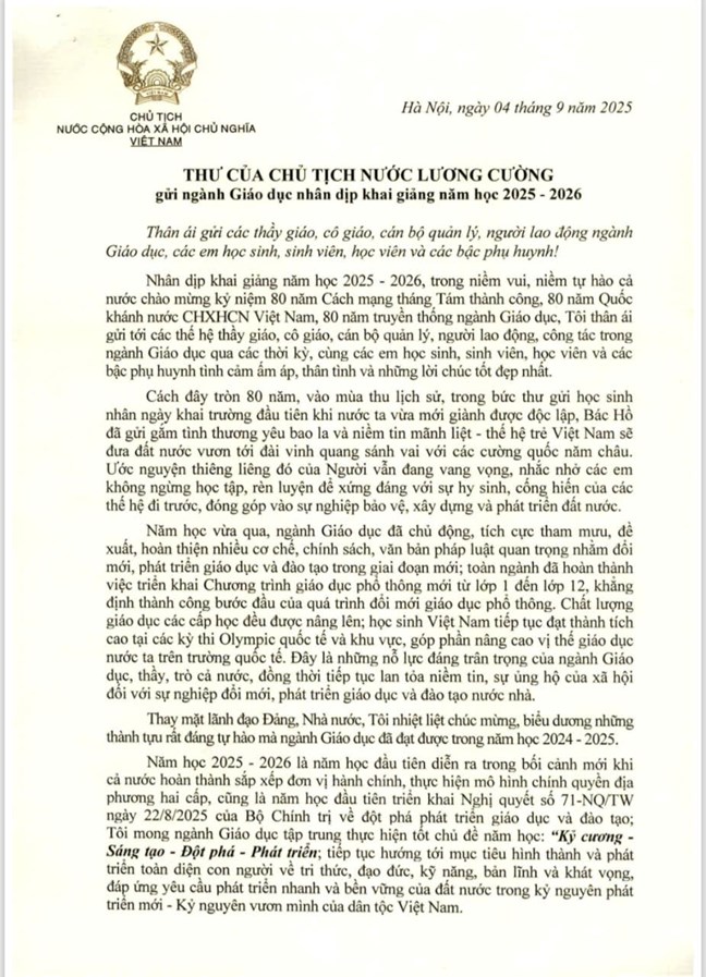 Dưới đây là thư gửi ngành Giáo dục của Chủ tịch nước Lương Cường nhân dịp khai giảng năm học mới 2025-2026: