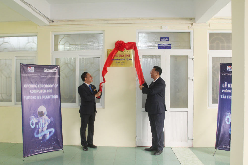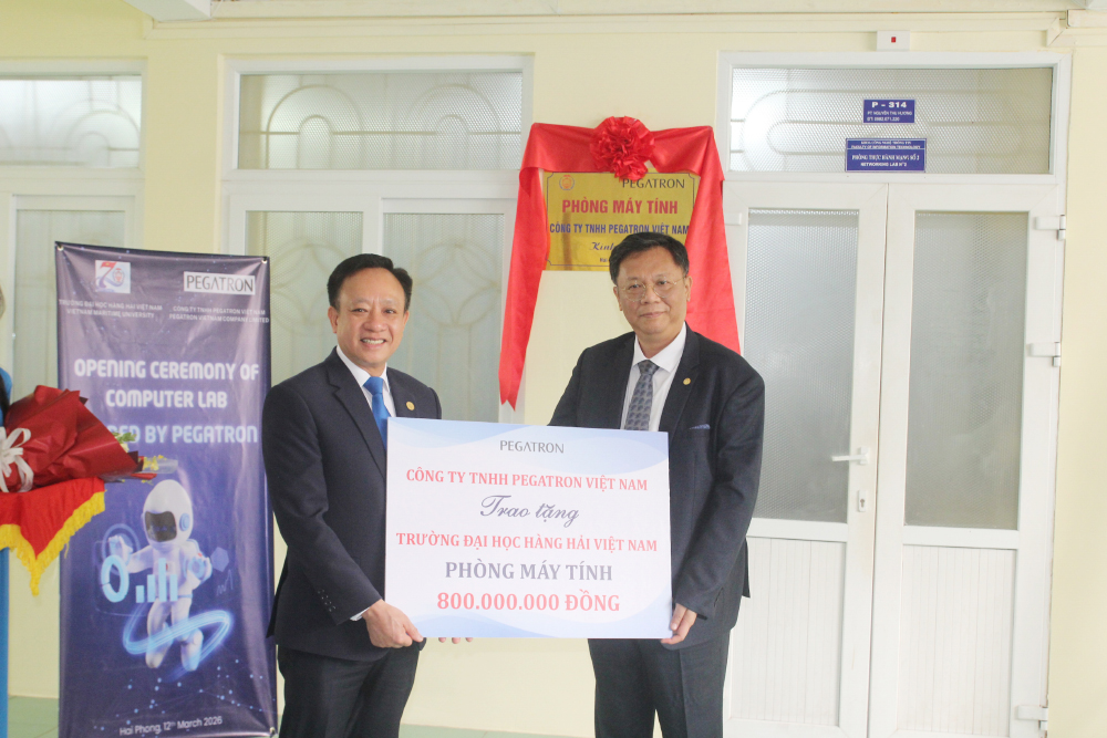 Trong khuôn khổ chương trình, ông Huang Jen-Chieh, Tổng Giám đốc Công ty TNHH Pegatron Việt Nam và PGS.TS. Phạm Xuân Dương, Hiệu trưởng Trường Đại học Hàng hải Việt Nam đã thực hiện nghi thức cắt băng khánh thành Phòng máy tính do Công ty trao tặng cho Khoa Công nghệ thông tin của Nhà trường. Phòng máy tính có tổng trị giá 800 triệu đồng, gồm 28 máy tính phục vụ giảng dạy và học tập, cùng 02 máy tính cấu hình công nghệ cao dành cho giảng viên và các nhà khoa học phục vụ nghiên cứu các đề tài, dự án. Hoạt động này không chỉ thể hiện sự hợp tác, gắn kết chặt chẽ giữa doanh nghiệp và Nhà trường mà còn mang ý nghĩa thiết thực hướng tới Chào mừng kỷ niệm 70 năm Ngày thành lập Trường Đại học Hàng hải Việt Nam (01/4/1956 - 01/4/2026).