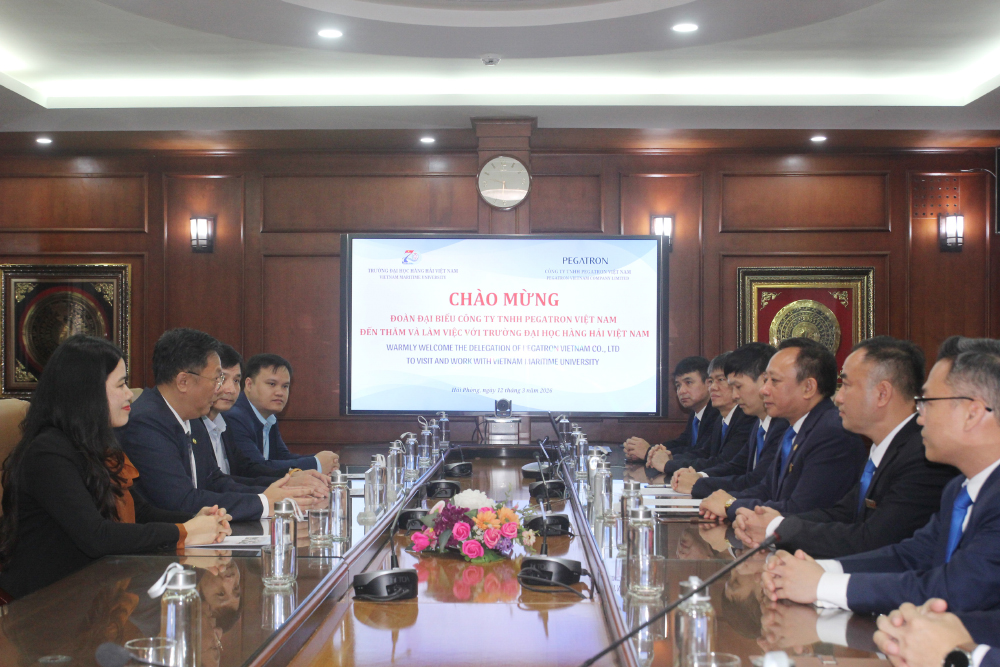 Ngày 12/3/2026, PGS.TS. Phạm Xuân Dương - Hiệu trưởng Trường Đại học Hàng hải Việt Nam đã tiếp và làm việc với Đoàn đại biểu Công ty TNHH Pegatron Việt Nam do ông Huang Jen-Chieh - Tổng Giám đốc Công ty làm Trưởng đoàn cùng các cộng sự. Nhân dịp này, Công ty TNHH Pegatron Việt Nam đã trao tặng Phòng máy tính cho Nhà trường nhằm góp phần tăng cường cơ sở vật chất phục vụ công tác giảng dạy, học tập và nghiên cứu khoa học.