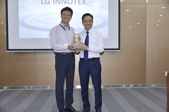 Thay mặt Đoàn, PGS.TS Phạm Xuân Dương- Hiệu trưởng Nhà trường trân trọng cảm ơn những tình cảm tốt đẹp mà phía quý Công ty dành cho Đoàn và mong muốn mở rộng hợp tác lâu dài với Công ty TNHH LG Innotek Việt Nam.