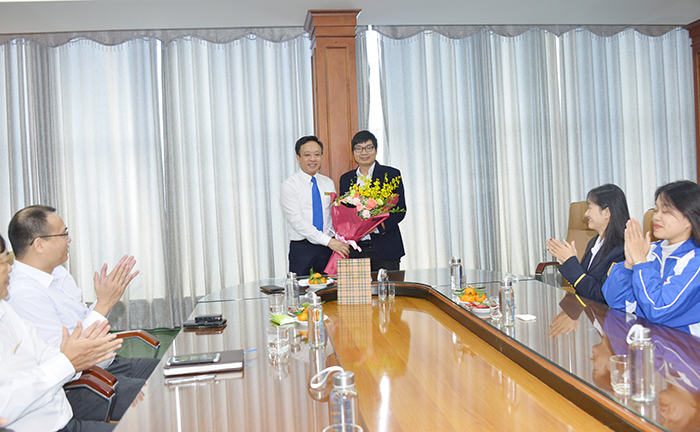 PGS.TS Phạm Xuân Dương - Hiệu trưởng Nhà trường tặng hoa chúc mừng thầy và trò Viện Môi trường
