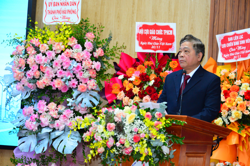Nhà giáo Phạm Ngọc Tuyền - Chủ tịch Hội Cựu giáo chức Trường Đại học Hàng hải Việt Nam phát biểu cảm ơn Nhà trường