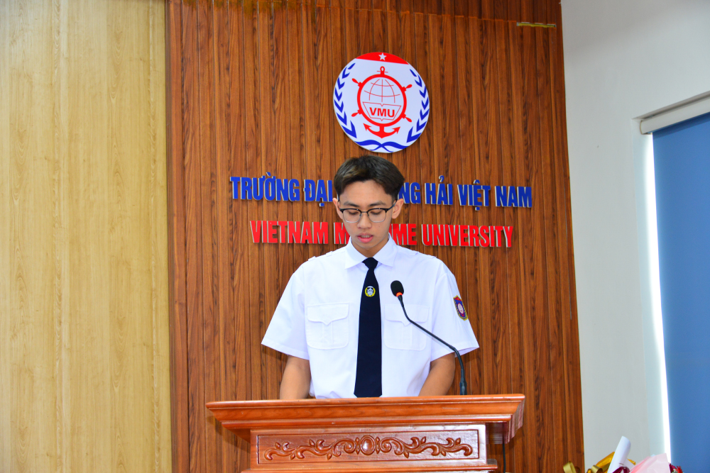 Tân sinh viên Trường Đại học Hàng hải Việt Nam, bạn Bùi Minh Thái đại diện cho các bạn đã trúng tuyển Đại học năm 2025 phát biểu cảm ơn
