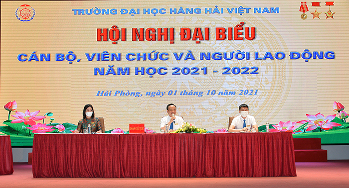 08h00 ngày 01/10/2021, tại Hội trường A8, Trường Đại học Hàng hải Việt Nam tổ chức Hội nghị đại biểu cán bộ, viên chức và người lao động năm học 2021-2022 để đánh giá kết quả thực hiện Nghị quyết Hội nghị CB, VC, NLĐ, tổng kết phong trào thi đua năm học 2020-2021, triển khai phương hướng, nhiệm vụ năm học 2021-2022, giải đáp các kiến nghị, đề xuất của CB, VC, NLĐ. Nhà trường đảm bảo tuân thủ chặt chẽ các yêu cầu về phòng chống dịch bệnh Covid-19.