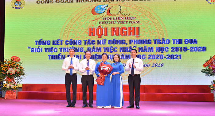Phát biểu tại buổi lễ đồng chí Phạm Thu Thưởng- Phó Chủ tịch thường trực Công đoàn, Trưởng Ban Nữ công Công đoàn Trường đã báo cáo chi tiết công tác nữ công năm học 2019-2020, triển khai nhiệm vụ năm học 2020-2021. Theo báo cáo, trong năm học 2019-2020 Ban nữ công luôn khẳng định được vai trò quan trọng và có những đóng góp to lớn cho sự phát triển vững mạnh, toàn diện của Nhà trường mặc dù có nhiều khó khăn, thách thức và ảnh hưởng của dịch bệnh Covid-19; biểu dương khen ngợi những nữ CB, GV, NLĐ làm tốt phòng trào “Giỏi việc Trường, đảm việc Nhà”, “Gia đình tiêu biểu”, nữ CB, GV bảo vệ thành công luận án Tiến sĩ và các chị có con đạt thành tích cao trong năm học 2019-2020.
