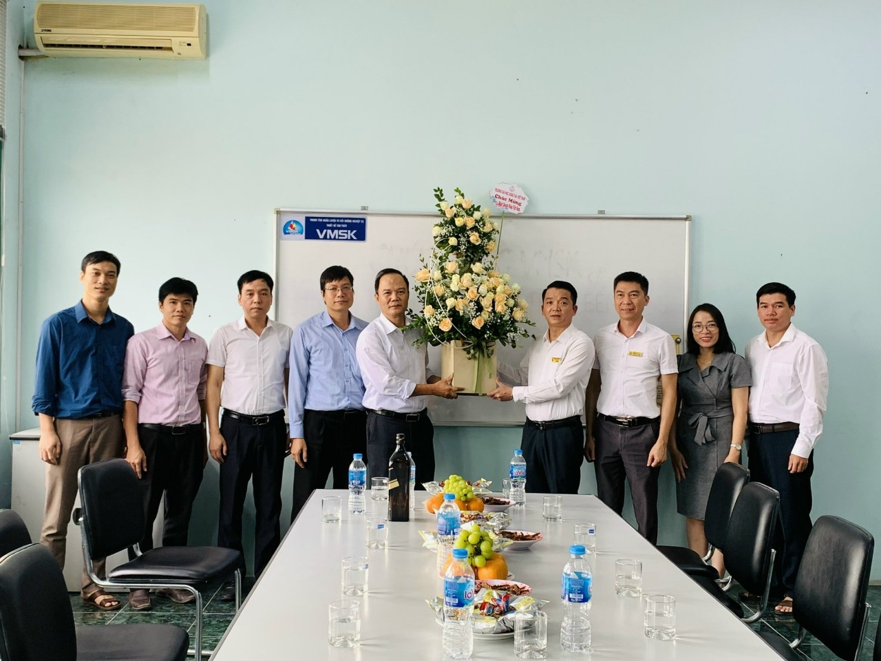 PGS.TS Nguyễn Khắc Khiêm - Bí thư Đảng ủy, Chủ tịch Hội đồng Trường tặng hoa chúc mừng Lãnh đạo Công ty VMSK
