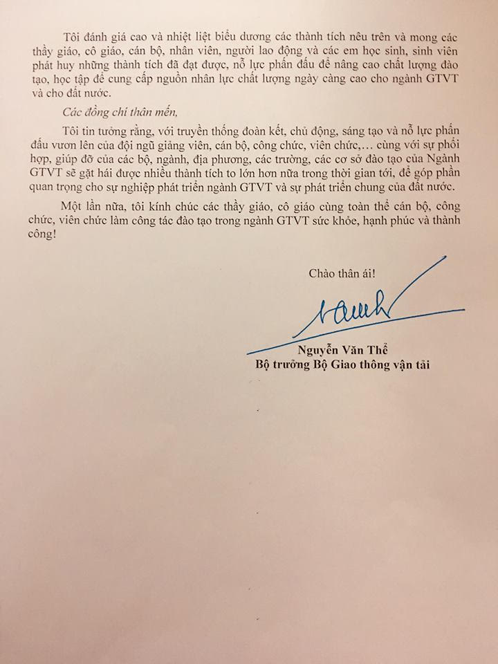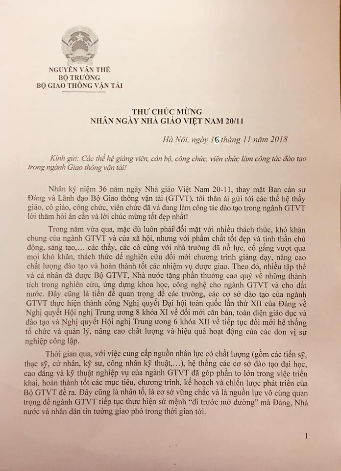 Thư chúc mừng 20-11 của Bộ trưởng Bộ GTVT Nguyễn Văn Thể