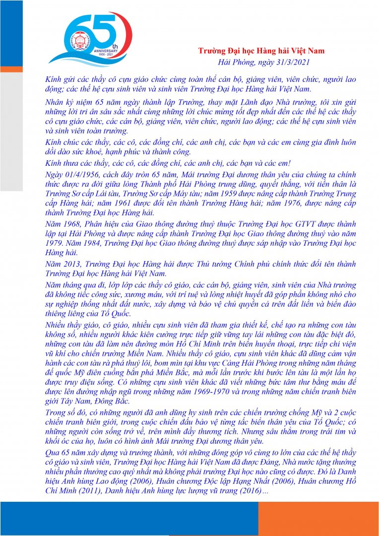 Thư chúc mừng của Hiệu trưởng gửi các thầy cô cựu giáo chức, cán bộ, giảng viên, NLĐ; cựu sv và sv toàn trường nhân kỷ niêm 65 năm thành lập trường.