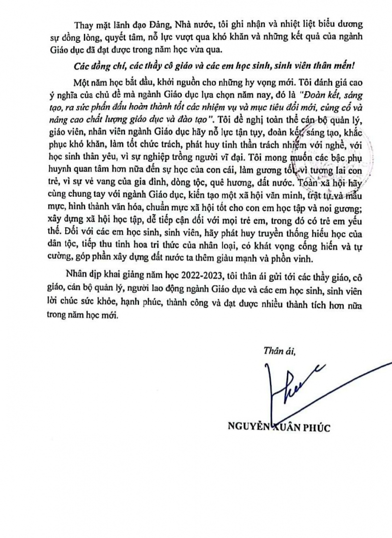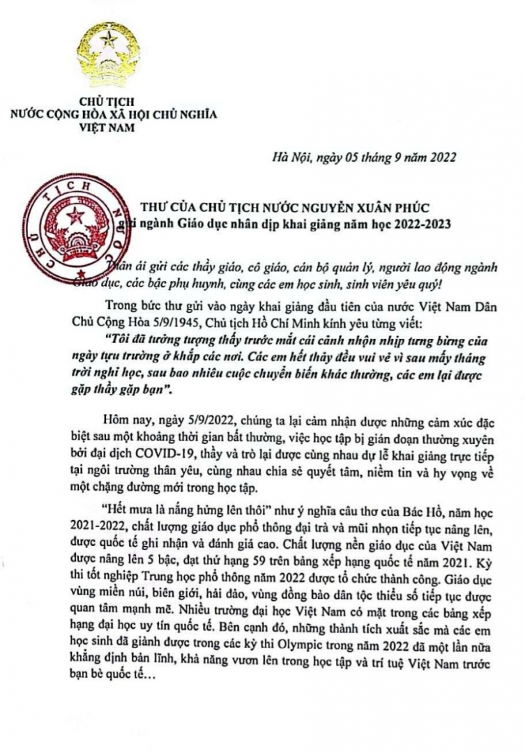 Thư của Chủ tịch nước Nguyễn Xuân Phúc gửi ngành Giáo dục nhân dịp khai giảng năm học 2022-2023