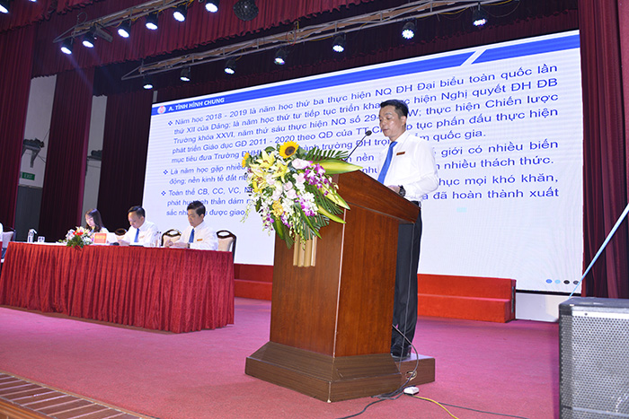 TS. Nguyễn Khắc Khiêm - Ủy viên Ban thường vụ Đảng ủy, Phó Hiệu trưởng Nhà trường thay mặt BGH báo cáo kết quả thực hiện năm học 2018-2019, phương hướng năm học 2019-2020.