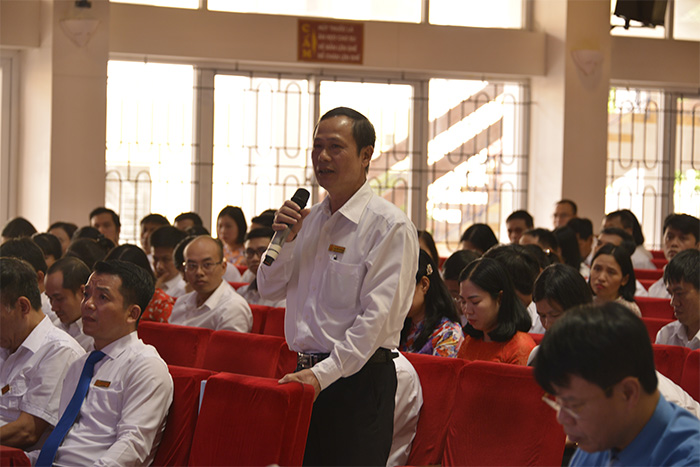 Trong không khí cởi mở, dân chủ, các đại biểu đã thảo luận tham gia ý kiến vào nội dung Báo cáo kết quả thực hiện Nghị quyết Hội nghị CB, CC, VC và NLĐ năm học 2018-2019 và phương hướng nhiệm vụ năm học 2019-2020, đồng thời đề xuất những giải pháp cùng với Nhà trường tháo gỡ khó khăn, tiến hành đổi mới mạnh mẽ, nâng cao chất lượng đào tạo, NCKH, hợp tác quốc tế, tăng cường cơ sở vật chất, cải thiện điều kiện làm việc, nâng cao thu nhập và đời sống vật chất, tinh thần,.... Thay mặt chủ tọa Hội nghị, PGS.TS Phạm Xuân Dương đã trực tiếp đối thoại và trả lời 07 ý kiến chất vấn, góp ý trực tiếp tại Hội trường của các đại biểu tham dự Hội nghị. Kết thúc phiên thảo luận, toàn thể Hội nghị đã cơ bản đồng tình với những nội dung trao đổi, giải đáp của PGS. TS. Phạm Xuân Dương - Phó Bí thư phụ trách Đảng ủy, Hiệu trưởng Nhà trường.
