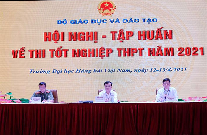 Trong 2 ngày 12,13/04 tại Trường Đại học Hàng hải Việt Nam, Bộ GD&ĐT phối hợp cùng Bộ Công an tổ chức Hội nghị tập huấn thi tốt nghiệp THPT năm 2021 cho đại biểu đại diện 63 tỉnh, thành phố nhằm phổ biến những điểm mới, điểm chính trong quy chế thi tốt nghiệp THPT cũng như một số nội dung về công tác tuyển sinh năm 2021. Thứ trưởng Nguyễn Hữu Độ - Trưởng Ban chỉ đạo cấp quốc gia của kỳ thi chủ trì Hội nghị. Cùng dự có lãnh đạo các đơn vị liên quan thuộc Bộ GD-ĐT, đại diện Bộ Công an, Công an các địa phương, Bộ Quốc phòng, lãnh đạo 63 Sở GDĐT.